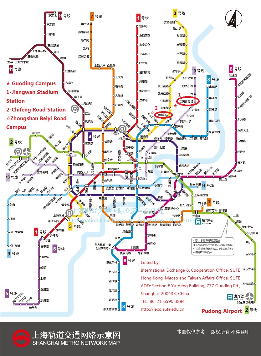 If you want to arrive at Guoding Road Campus of SUFE from Pudong Airport, you can choose to take the subway(line 2 ) immediately inside Pudong Airport and transform from Line 2 to Line 10 at East Nanjing Road Station. You get off at Jiangwan Stadium Station. Then you can choose to take the bus(No. 99) across the street or take a 20 minutes’ walk to our Guoding Road Campus.
