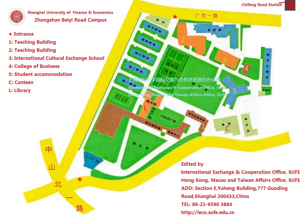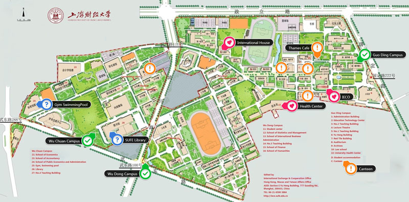 Guoding Road Campus of SUFE is separated into three parts, including Guoding Road Campus, Wudong Road Campus and Wuchuan Road Campus.